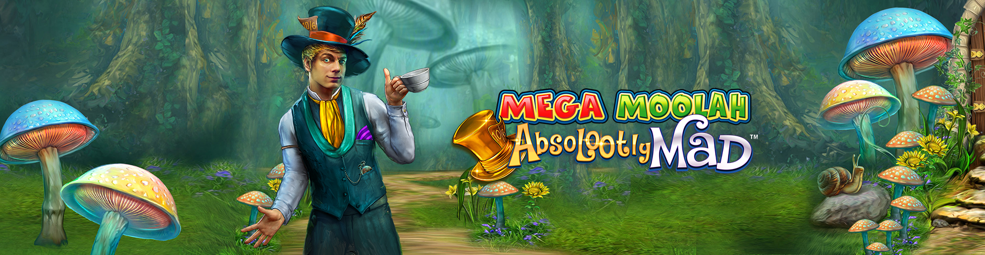 The Mad Hatter’s coin represents the Wild symbol in Absolootly Mad Mega Moolah and will only spin on the second, third, and fourth reels, and will substitute for all others whenever there’s the chance of creating a new win.